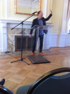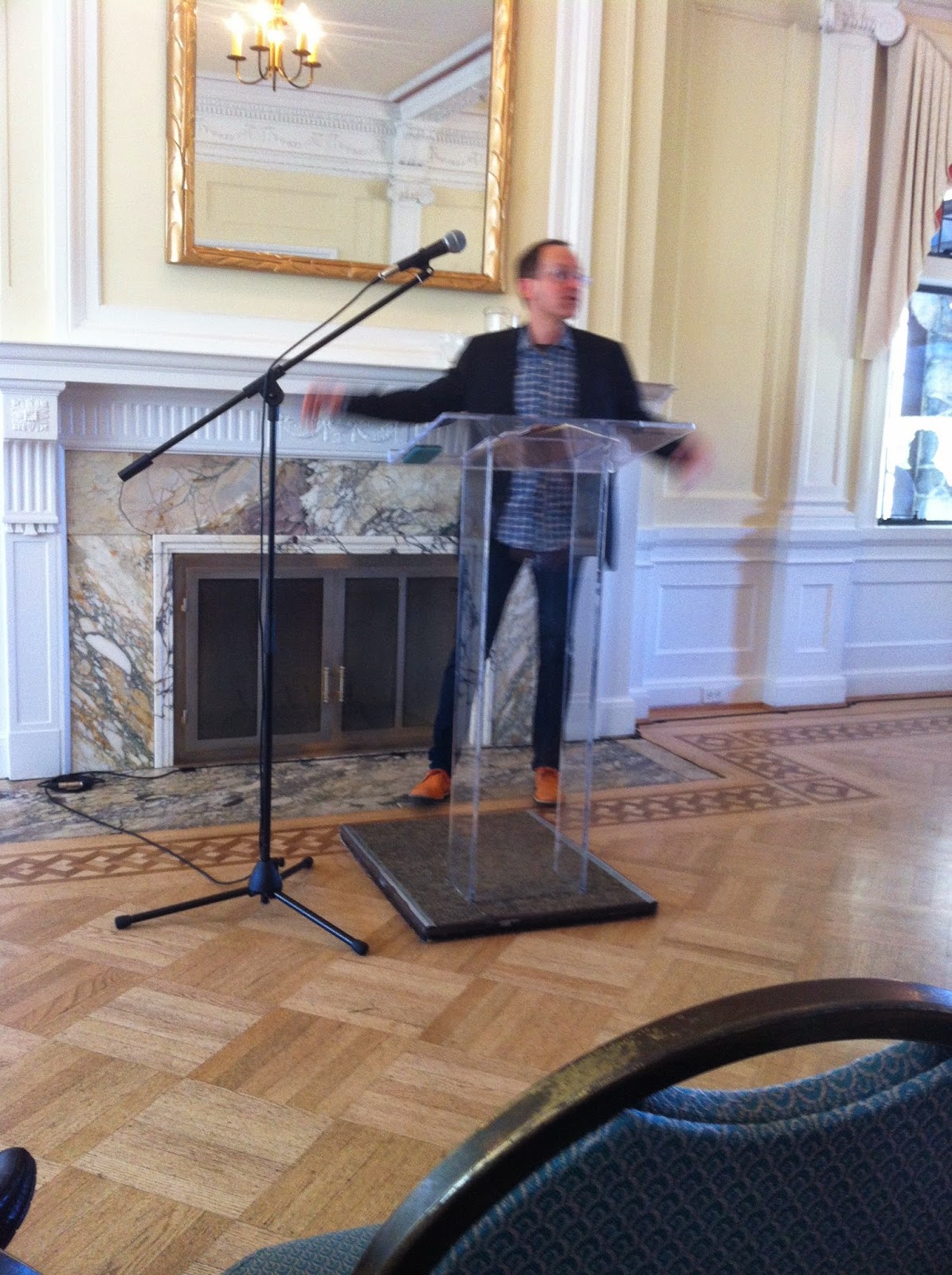 His talk drew out a conceptual antithesis that marks the lyric, an ambivalence between the transcendental, “departicularized” tendency of lofty abstract language – that it happens anywhere, outside of history – and the concrete particularities of descriptive circumstance, that whatever happens inevitably has to happen somewhere, to someone. What’s interesting for me aren’t the terms of this opposition, which are so general as to be fairly banal, but Burt’s energetic investigation of the tensions between them as the stuff and the source of poetic work. Most loco-descriptive poetry, he argued, connect outward geography – I’d suggest, physiography – with “inner life” – I’d suggest not only physiology but also psychic topography. What persists, despite claims by Charles Altieri and others that the poetry of place has long since run its course, is according to Burt an intuitive sense of commonality tied to imagined place: that place, however articulated, is still intersubjective, communal. He concentrated on the work of two key poets, for him: C. D. Wright and Mary Dalton. Quoting from Wright’s “Ozark Odes” – “Maybe you have to be from here to hear it sing” – Burt developed the homonymy of here and hear to suggest that Wright’s poems generate the textures and particularities of place apophastically, allowing the reader access through lyric attention, through the melopoeic richness of her geographically precise diction, to a phenomenologically rich encounter with that particularity. You hear the place, you sense it, palpably, in Wright’s words, despite and even because of her skeptical refusal to claim communicative success. The withdrawing “melt” of her language, in other words, is also recombinant and evocative, a plenitude. Burt gestured at Elise Partridge’s poem “Dislocations” (from Chameleon Hours, 2010 version) which also presents a “hybrid” form of lyric apophasis, refusing to lay claim to any naïve or grandiose transcendence while also, at a moment of surprising intensity, discovering how poetic intelligence still fuses to its descriptive objects, as “you feel your strengths intermingling.” One of the pleasures of Elise Partridge’s poetry, Burt said, is that its “attention to place does not preclude migration from one place to another,” and that some of her best work inheres in those transitions and intermediations. He concluded his talk with an investigation of some of the poetry of Mary Dalton. He was especially taken with how human geography and dialect words, in her poems, “imply the physical geography that the words produce.” He focused on the seductive estrangements of encountering the moments when she seemed to open her Newfoundland word-hoard. “Maybe you don’t have to be from there,” he concluded, “to hear it sing.”